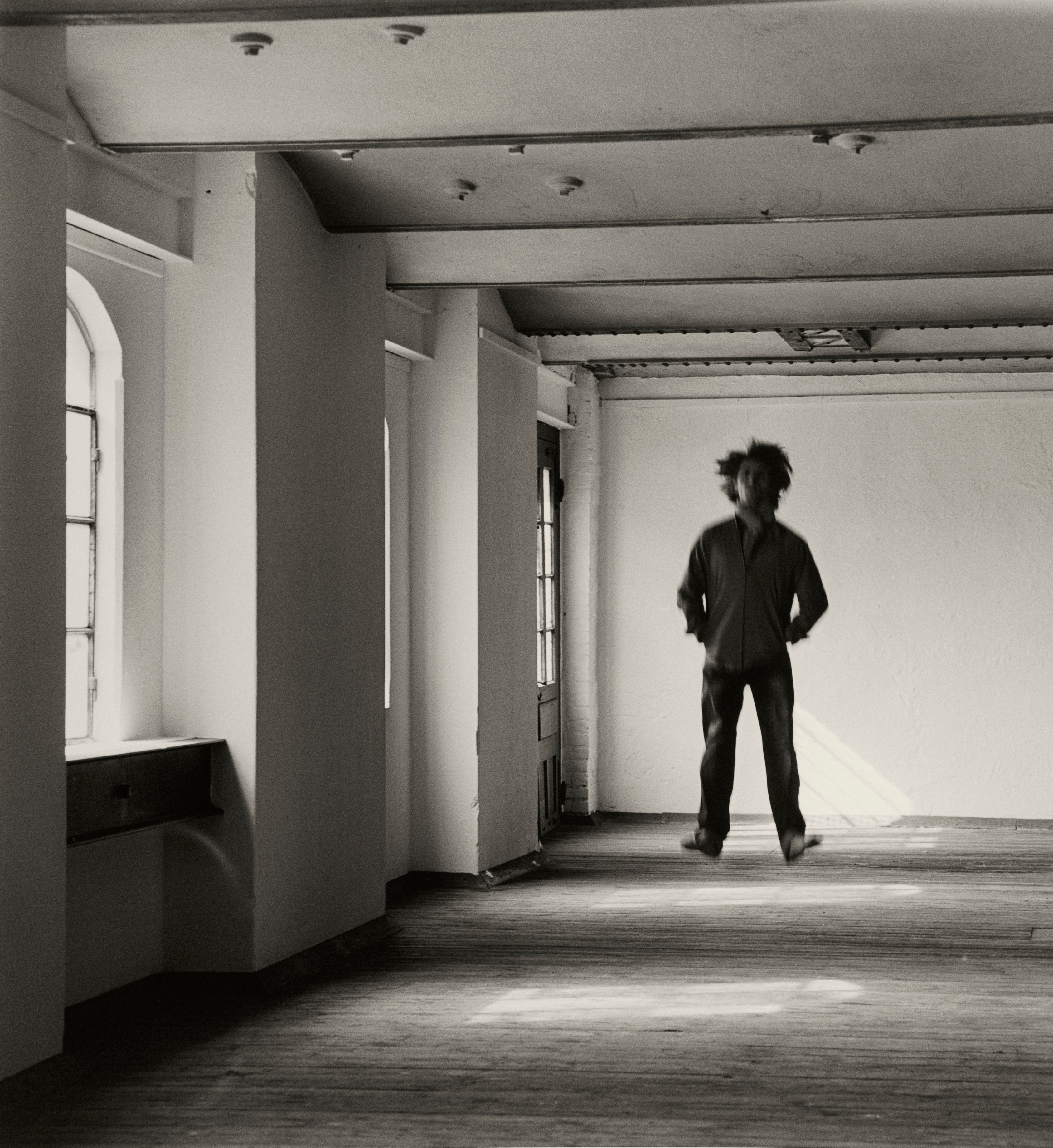 'Bird Floor Window' was made in Hamburg in one of the old port buildings. The old, well worn wooden floor is resonant of dance rehearsal floors of the ages, of the many hours of anonymous rehearsal both mundane and profound, behind every great artist. The dancer's legs are barely visible. Silver gelatin photograph from an original analogue negative - A medium format camera was used with silver gelatin negative film. Darkroom print by the artist.